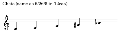 - Name Of Scale: Chaio (same as 6/26/5 in 12edo)